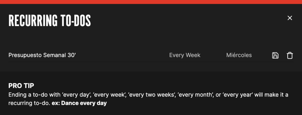 En mi aplicación de TeuxDeux, tengo configurada la función para que cada Miércoles aparezca esta tarea pendiente. La ciencia nos recomienda hacerlo el mismo día y en el mismo rango horario semanal para ser exitosos en formar el hábito.